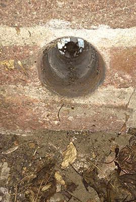 1. We boren een cilindervormige koker van buiten naar binnen naar uw kruipruimte. Dit noemen we een renovatiekoker De hoek, grootte en positie van de koker meten we nauwkeurig van tevoren. Aan beide uiteinden van de koker plaatsen we een rooster.